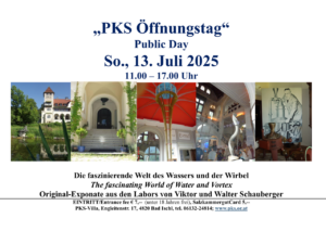 Unsere Besucher erhalten Einblicke in „Die faszinierende Welt des Wassers und der Wirbel“ und in die Forschungen von Viktor und Walter Schauberger anhand von Original-Prototypen. Laufend Führungen zwischen 11 und 17 Uhr. Keine Anmeldung notwendig.